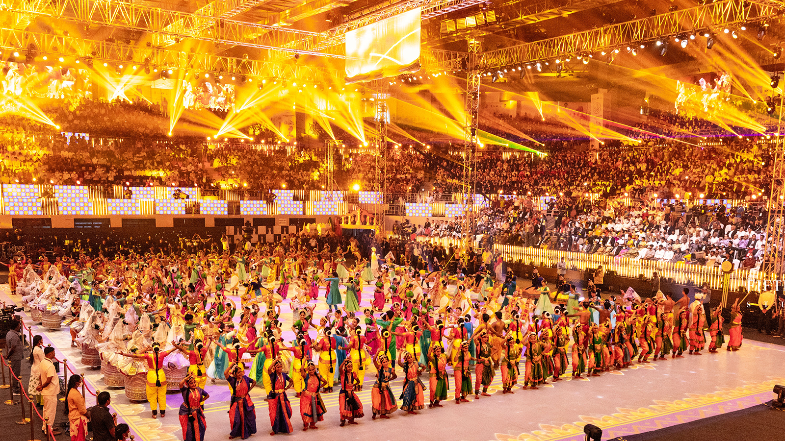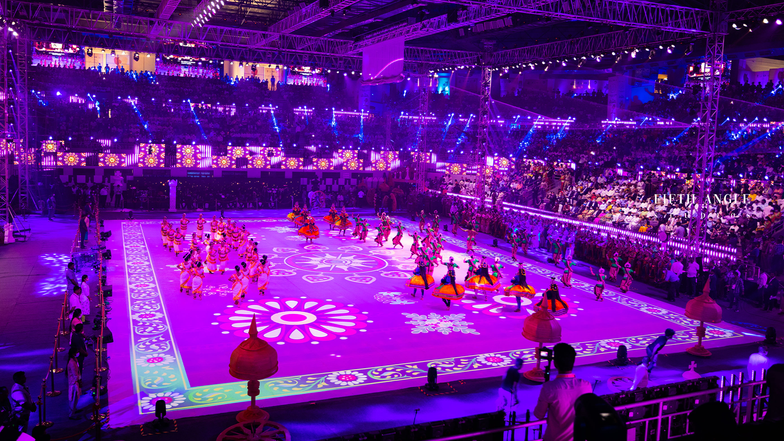 49 Sharpy lights, a SHOWTEX high speed reveal roller mechanism, multiple spreader and sub-hang trusses - including 18 nos of 22,000 lumin BARCO projectors - were used to project the brilliant visuals shown at floor level.