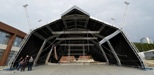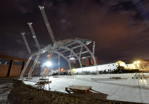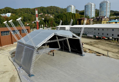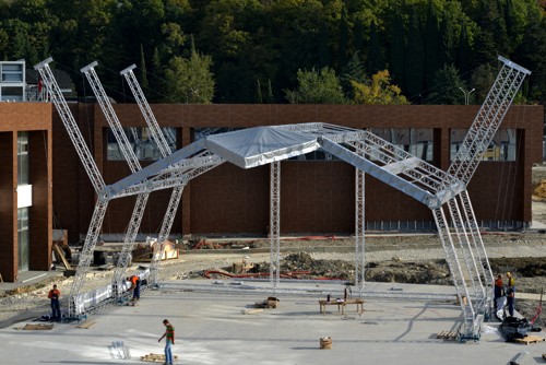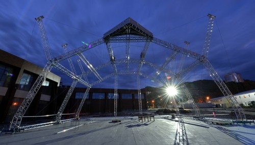 Materials: M390 Quatro truss systems (roof), M390KT – main tube 50 x 4mm, brace 25 x 3mm (Legs/Arches), M390L Quatro truss – main tube 48 x 3 and brace 20 x 2mm (two rear legs and flying roped columns)